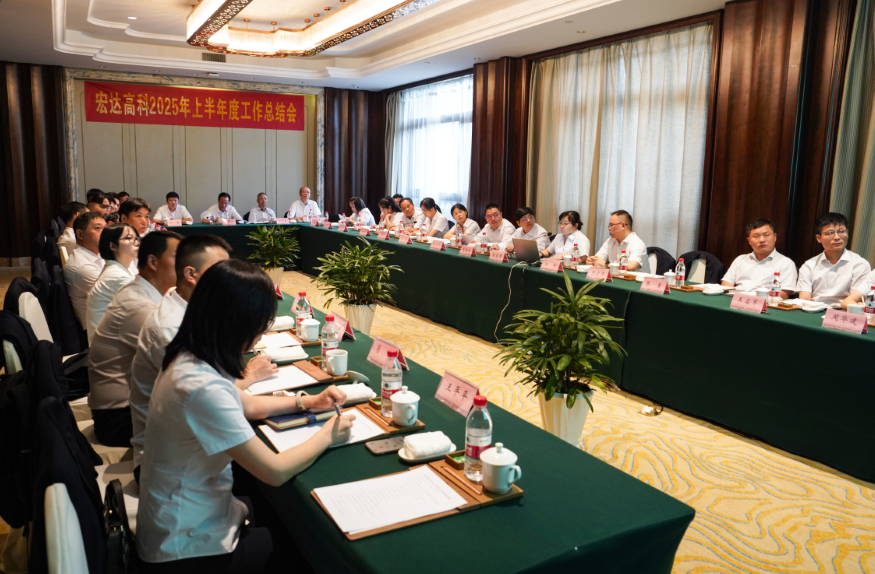 8月2日下午,宏达高科控股股份有限公司在“钱江君廷”召开2025年上半年度工作总结会议,总结回顾上半年工作情况,研究部署下半年工作任务,宏达控股集团董事长兼“宏达高科”董事长沈国甫、集团总经理兼“宏达高科”副董事长沈珺,“宏达高科”总经理许建舟、公司管委会成员和中层干部共35人参加会议。