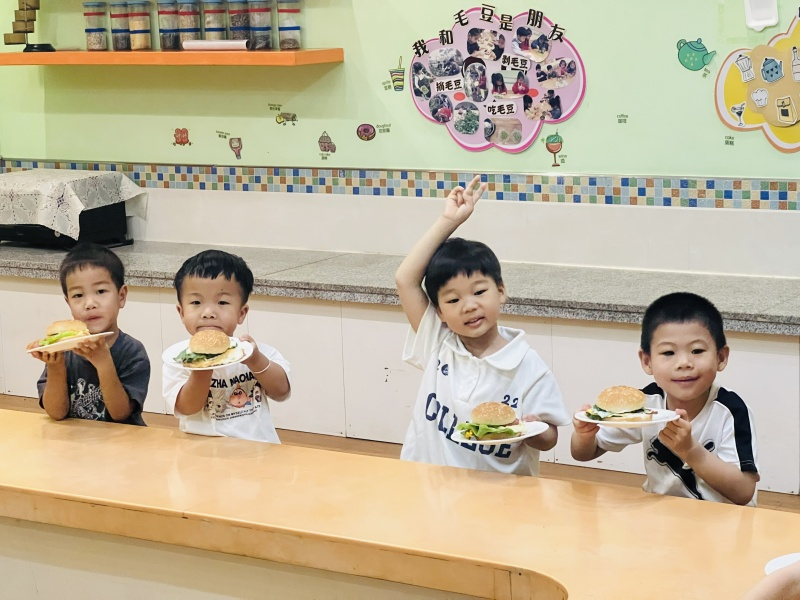 托班幼儿们在老师的帮助下,制作了充满夏日气息的饮料“西瓜养乐多”;小班幼儿们系上围裙,化身“小小厨师”,在老师指导下为父亲制作了鸡丝凉面;中班的“汉堡超人”制作现场热闹非凡,幼儿们将面包、肉饼、生菜层层堆叠,用番茄酱画上超人标志,创意十足的汉堡饱含着对爸爸如超人般守护的敬意;大班的孩子们专注于帮爸爸制作钥匙扣,用扭扭棒塑造出爱心、汽车等造型,印上自己的指纹,刻上“爸爸专属”字样,将对爸爸的爱融入小巧精致的钥匙扣中。