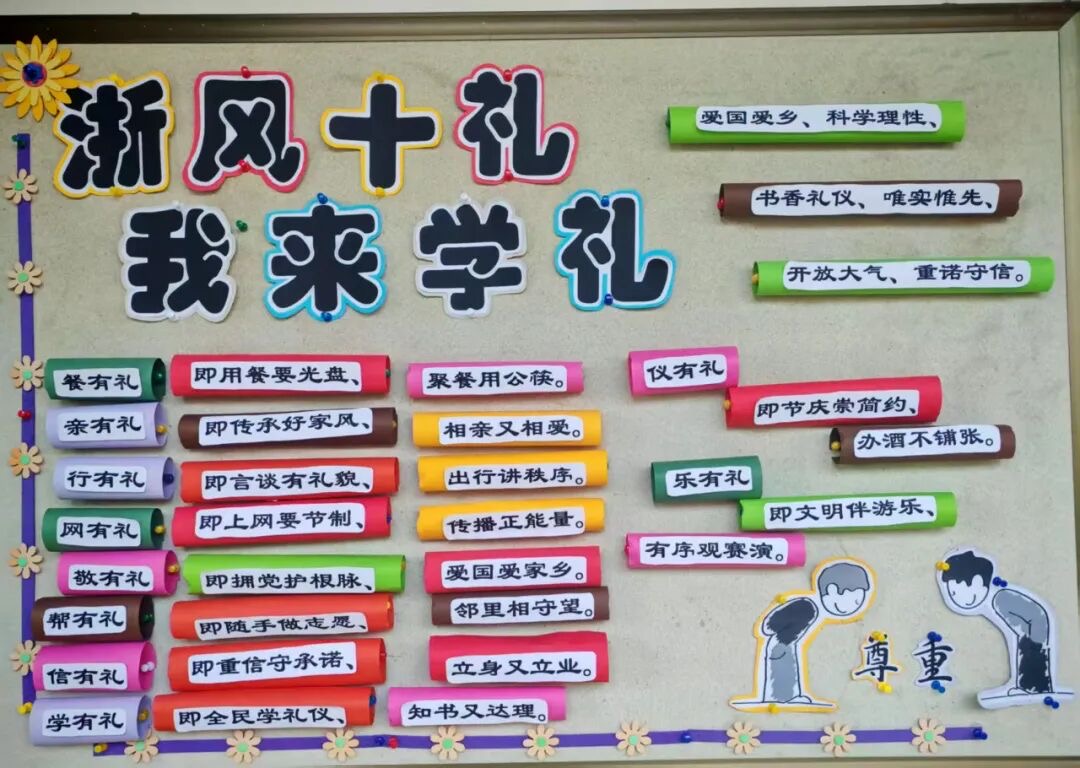 礼仪之美方面,“浙风十礼”宣传栏清晰呈现“餐有礼”、“学有礼”等规范,引导学子传承中华美德。