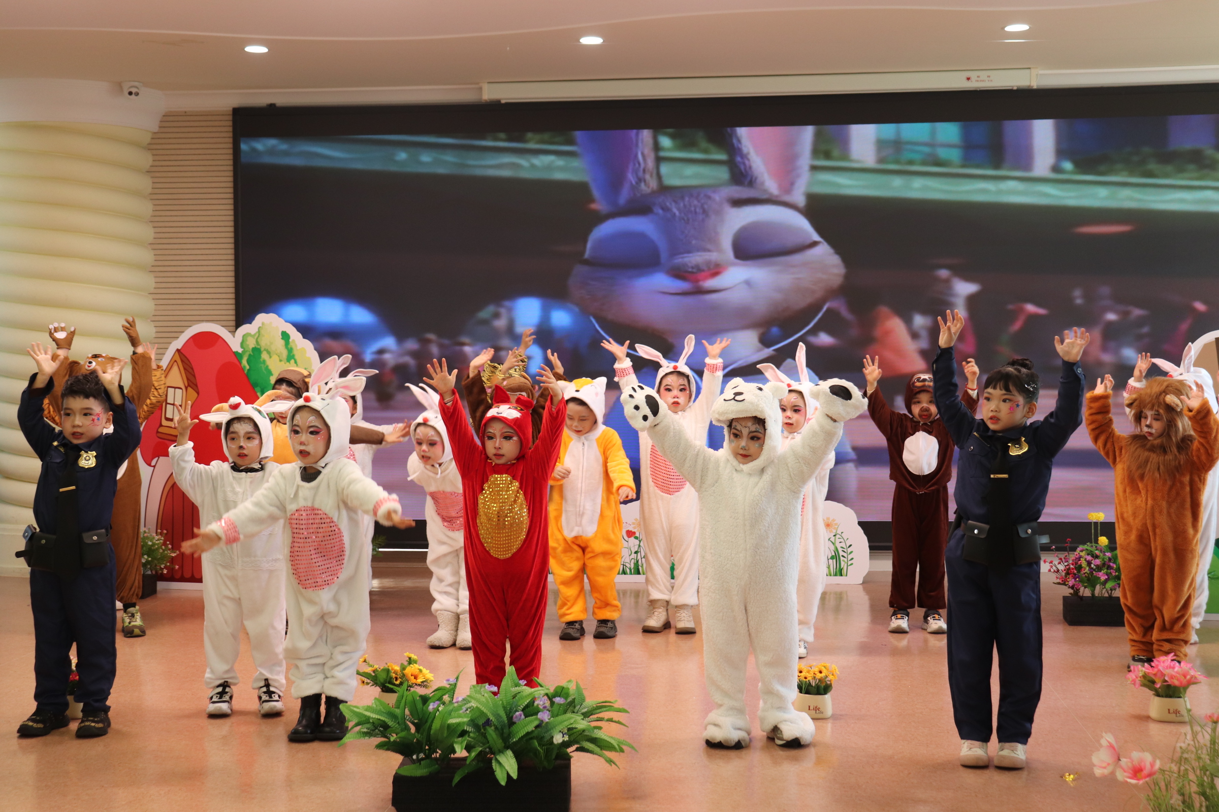 本次活动由两位老师和两位小朋友主持。为了让未能到场的家长也能共享这份喜悦,活动特别采用全程直播的形式,实时传递孩子们的精彩瞬间。活动在托班宝贝们活力满满的表演中拉开序幕。《新年好》的欢快旋律响起,萌娃们身着喜庆服饰,踩着轻快的节奏舞动;随后,小、中、大班的孩子们依次登场,带来《Zootopia Story》《Little Red Riding Hood》《The Daughter of the Sea》等经典英语童话剧表演。小演员们身着精致的角色服装,化身童话世界里的小精灵,用生动的肢体语言、稚嫩却真挚的台词表达,将一个个经典故事演绎得惟妙惟肖。地道的英语口语、默契的团队协作,赢得了现场师生与线上家长的阵阵掌声。活动最后,有托班宝宝们带来的节目《放鞭炮》,更是将新年的热闹氛围瞬间拉满。