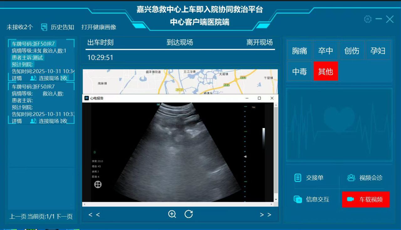 以往,传统的超声设备因其体积大、操作环境要求较高,难以适配并进入救护车这样空间有限且移动颠簸的急救场景。这台小巧的设备实现了与医院系统的互联互通,扫描影像能实时回传至院内,让急诊医生提前研判、做好准备,真正实现了 “病人未到,危症先判”,为医院内提前制定抢救方案争取到了宝贵的时间窗口。