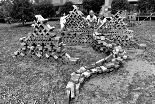 昨天上午,同济大学浙江学院里19座红砖堆成的别致“建筑物”拔地而起。由《建筑设计基础》课程教学延伸而出的同济大学浙江学院第八届建造节在校园内开展,19组大一学生每组3000块砖,以“律”为主题展开多元的创意建构。