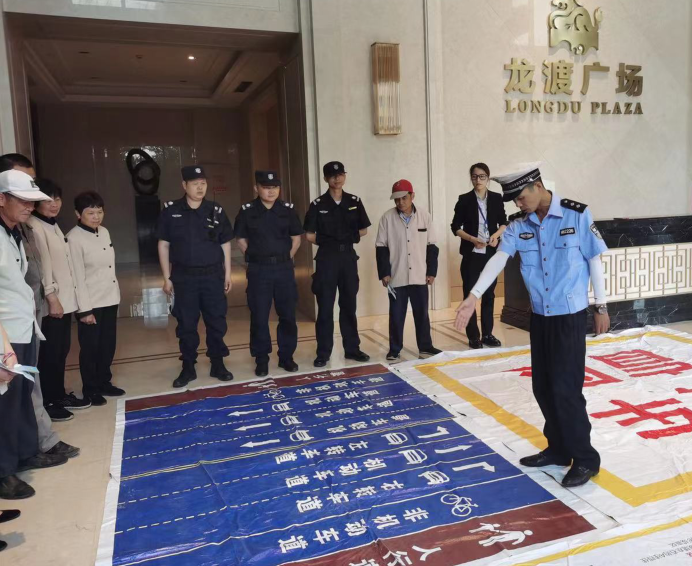 5月21日下午,许村交警队交警来到“龙渡广场”,向“宏达世博置业”员工宣传防范电信诈骗和交通安全知识,提醒大家防范电信诈骗、预防交通事故