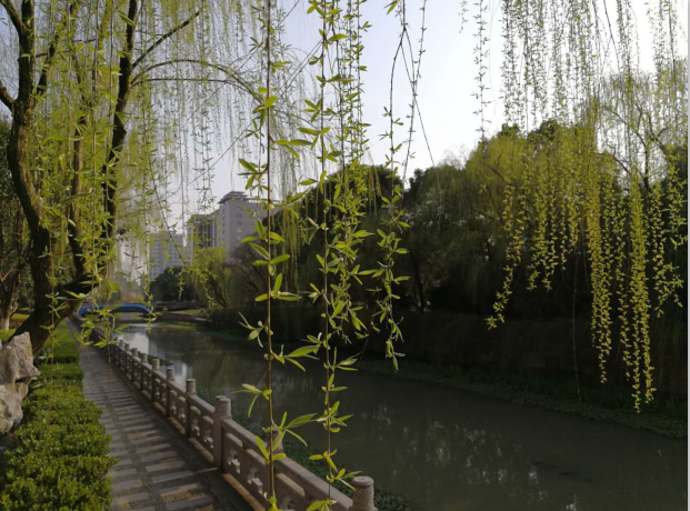 宏达大厦院内杨柳依依,春意盎然