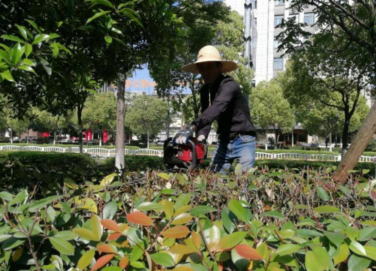 4月19日,“宏达科创”员工正不适时机给石楠“理发”,营造优美环境