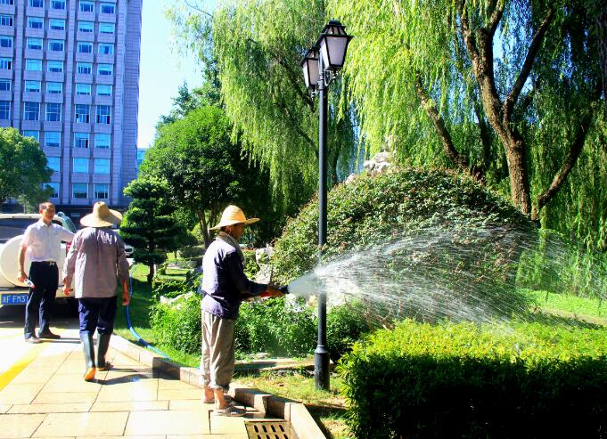 连日高温,“宏达科创”员工给绿植浇水“解渴”