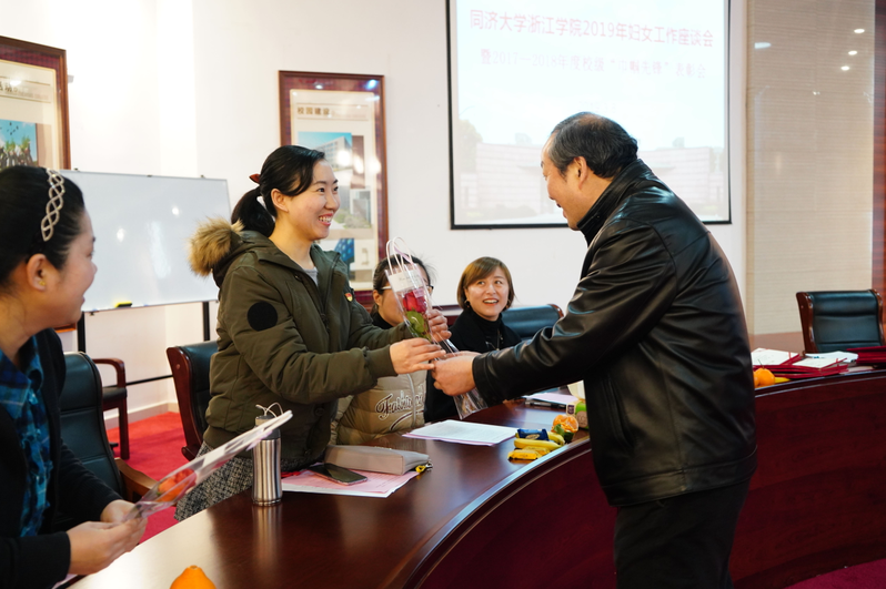 3月8日,“同浙”召开妇女工作座谈会,校领导向学校”巾帼先锋“获得者献花
