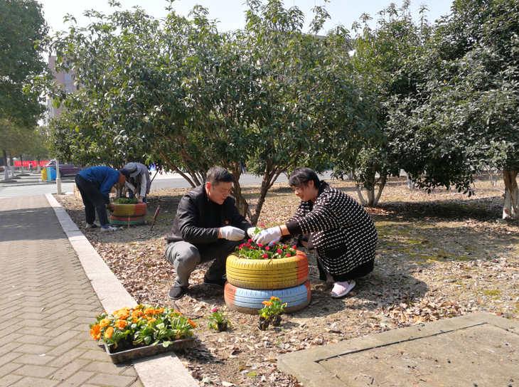 3月19日,“教育后勤”员工利用废旧轮胎栽种鲜花,美化校园