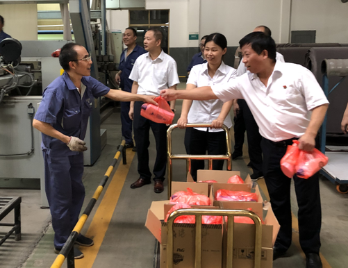 8月12日上午,“宏达高科”管理人员慰问车间一线高温岗位员工,向他们发放了防暑降温用品