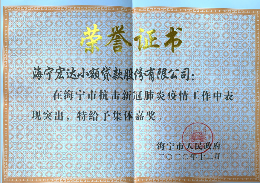 12月28日上午,海宁市举行抗击新冠肺炎疫情工作表彰大会,“宏达小贷”荣获“海宁市抗击新冠肺炎疫情工作表现先进集体”称号