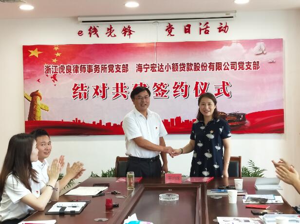 7月5日,海宁宏达小额贷款股份有限公司党支部与浙江虎良律师事务所党支部在“虎良律所”活动室举行结对共建签约仪式,“宏达小贷”党支部14名党员、1名入党积极分子和“虎良律所”党支部7名党员、1名入党积极分子参加了签约仪式。