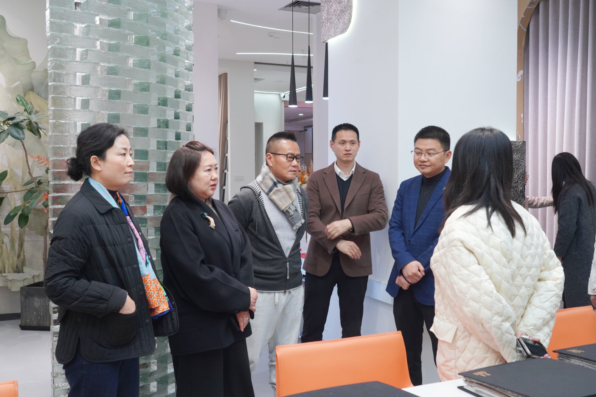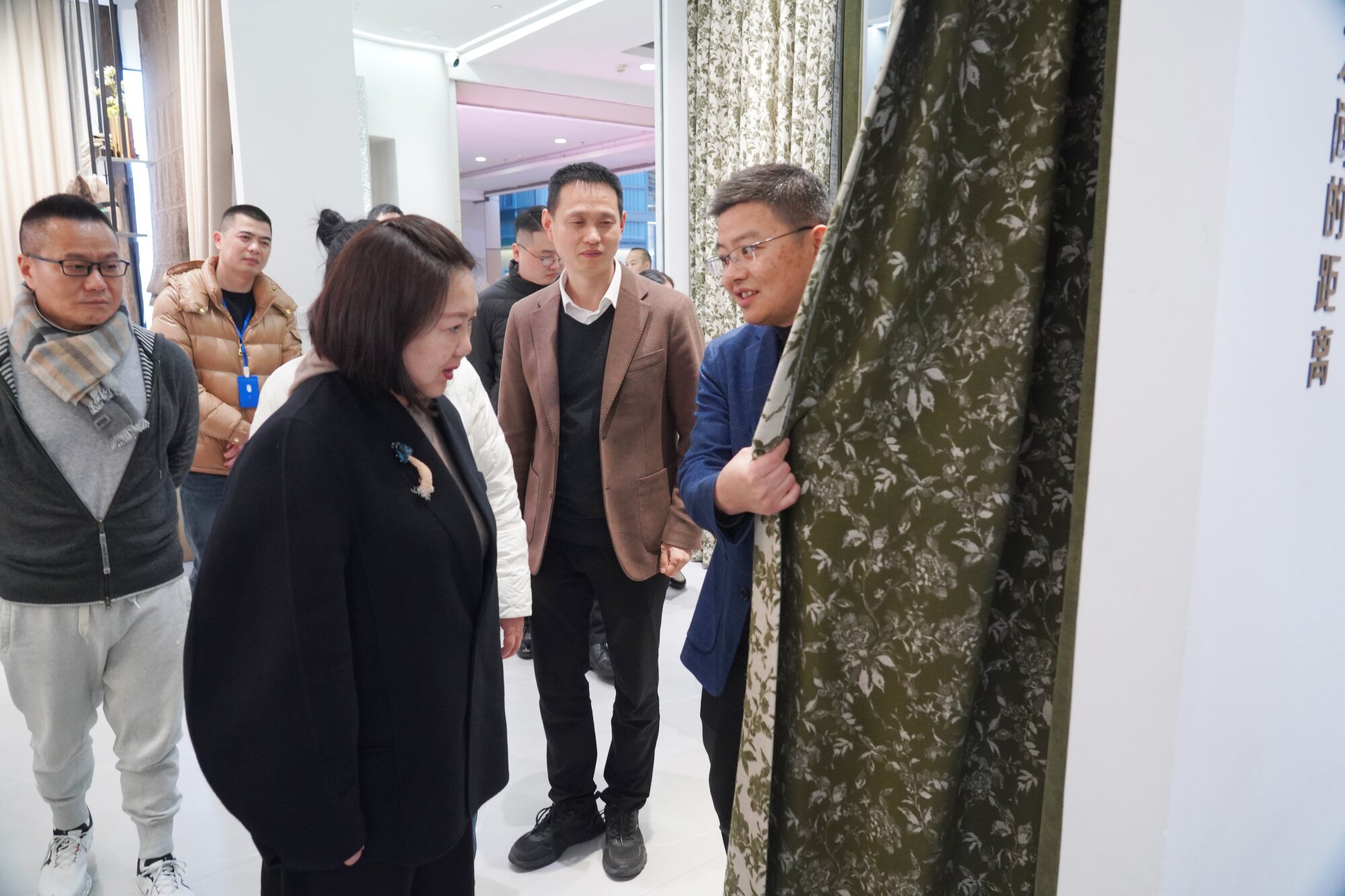 在家纺城国贸中心,廖晓辉主任一行先后走访考察了“玉園”、“布朗斯”等多家品牌企业展厅,与展厅负责人展开交流,详细询问和了解企业在面料研发、工艺升级、营销拓展等方面的探索与发展,并围绕成品窗帘标准化生产与定制化服务需求、同城直播营销等话题进行了深度的交流与观点分享;在位于杭海面辅料中心的“中纺·瓅锦”承创空间,实地考察了纺织文创产品及国风时尚面料发展,详细了解了企业借助传统织锦工艺,将传统纹样、技艺创新应用于国风服饰面料与国潮文创产品的实践与成果,期间对蜀锦、蜀绣的创新与产业化应用进行了深入探讨。