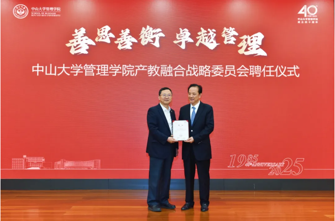 会上,举行了管理学院产教融合战略委员会成立仪式,沈国甫董事长获聘为中山大学管理学院产教融合战略委员会委员,中山大学校长高松院士为全体委员颁发聘书。委员会委员涵盖院士、企业家、行业协会负责人及国际学者,将聚焦“管理+科技”交叉创新,推动学术成果向产业应用转化。