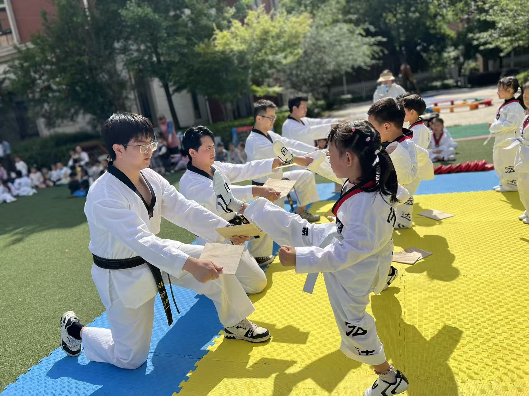活动中,幼儿们身穿跆拳道服,精神抖擞,不同年段的幼儿们分别展示了马步冲拳、前踢、横踢、侧踢等多个技术动作,个别孩子还进行了两两一组的对抗展示,充分展现了跆拳道“礼仪、廉耻、忍耐、克己、百折不屈”的精神。最后,教练们也向大家展示了回旋踢、双飞等独特的技能与魅力,收获了幼儿们热烈的掌声。