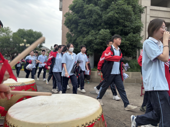 校园内,激昂的乐鼓声如战歌奏响,高三学子们身着校服,步伐自信稳健,从教学楼中昂首走来,他们目光坚定,无畏无惧,向着梦想全力进发。