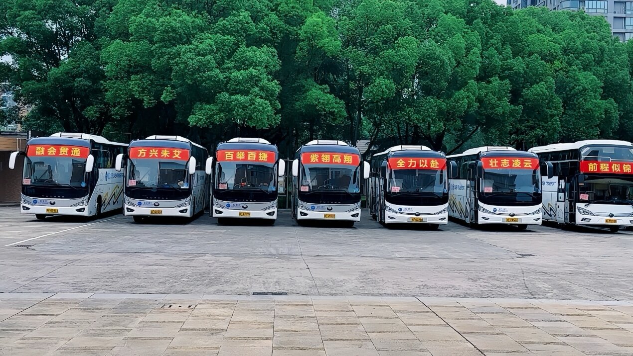 送考车辆整齐排列,每一辆车的名字都与高三各班班主任的期许相呼应,承载着无尽的祝福。