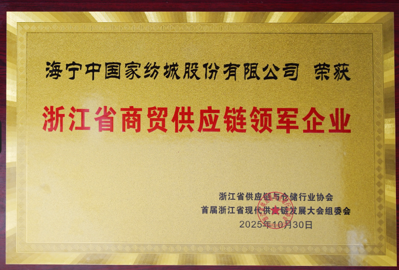10月30日,由浙江省供应链与仓储行业协会、浙江省公铁物流联盟联合主办的2025首届浙江省现代供应链发展大会在浙江海宁举办,现场正式揭晓2025年浙江省商贸供应链领军企业名单,海宁中国家纺城股份有限公司凭借在供应链平台建设、服务管理等领域的综合实力与突出表现,成功斩获该荣誉称号。