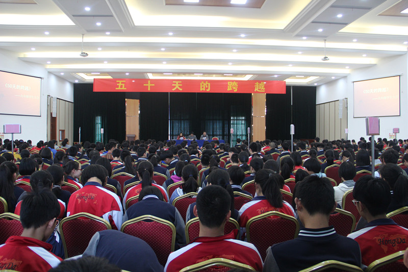 4月27日,上海外国语大学附属浙江宏达学校在学校新报告厅举行了以“五十天的跨越”为主题的九年级学生大会。全体九年级师生参加大会。