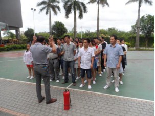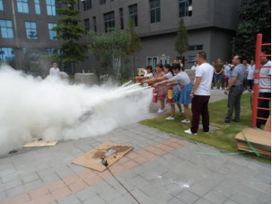 演习开始,公司综合部助理李金龙大声呼喊:“起火啦!” ,在安全部人员的指引下,参演员工迅速沿疏散楼梯往一楼空旷地点集合。之后,安全部清点人数,并立即向总指挥报告,全程用时1分8秒;演习后,公司组织员工进行了灭火练习。安全部人员在院内空旷位置点着油桶,演练职工分批拿起事先准备的干粉灭火器,进行灭火操作,亲身体验使用灭火器灭火的过程。
