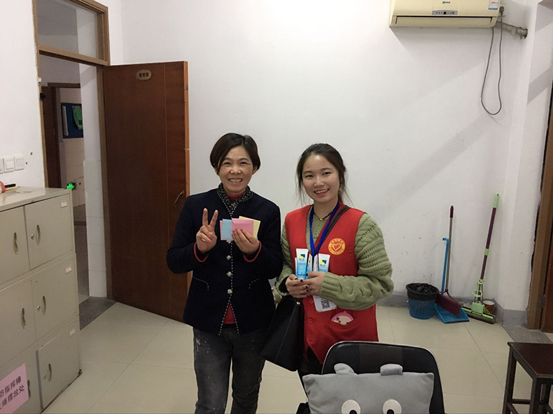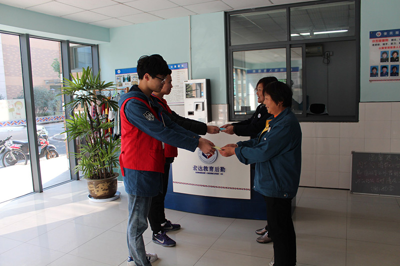 当日一早,志愿者们分成几组将精心挑选的小礼物送至每幢公寓楼的值班室,并感谢叔叔阿姨们平日里的辛勤劳动和关心爱护。一支小小的护手霜令7号楼保洁员王小妹十分感动,因为平时的保洁工作使她的双手在冬天容易变得干燥粗糙,收到这么贴心的礼物,她开心极了;志愿者还收集了许多写着学生们关怀话语的卡片给每位值班员、保洁员,小小的一张卡片上,承载了后勤员工和学生之间深厚的情谊;下午,志愿者还陪同保洁员一起巡查楼道,协助他们清理公寓楼内的违法和过期小广告。