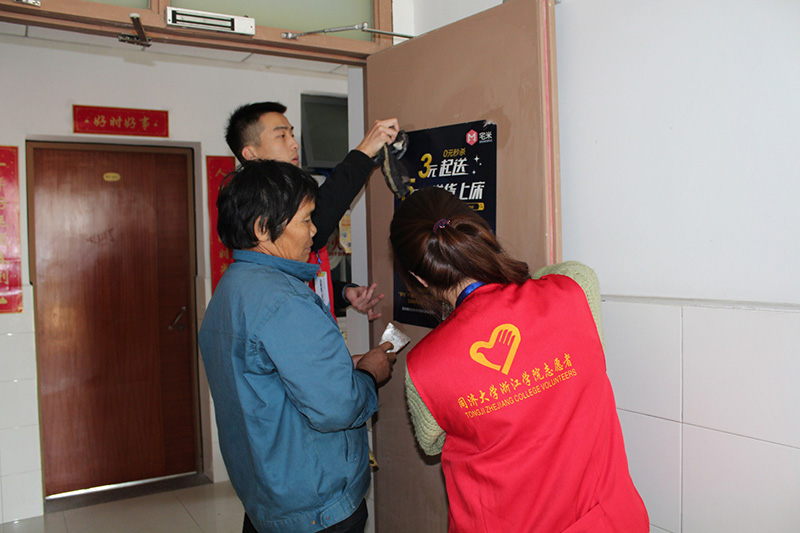 志愿者帮助保洁员清洁楼道上的小广告