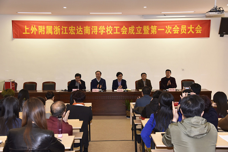 成立大会在雄壮的《国歌》声中拉开帷幕。学校党委书记张云源致开幕词;章兴荣副主席宣读了《关于上海外国语大学附属浙江宏达南浔学校工会成立的批复》;姚明星主席作了讲话;会议进行了第一届工会委员候选人名单审议和大会监票人、计票人名单审议。