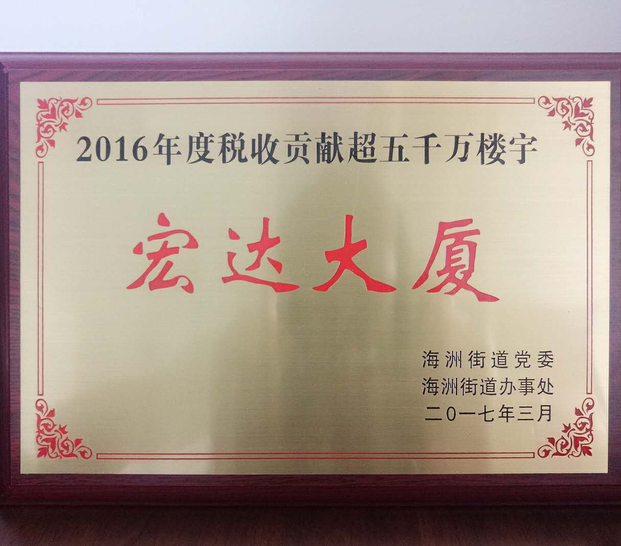 近日,海宁市海洲街道办事处在办事处3楼会议室召开2016年度楼宇经济表彰大会,宏达大厦作为海洲街道唯一一座年度税收贡献超过5000万的楼宇,在大会上被授予荣誉奖牌并获得5万元奖励。