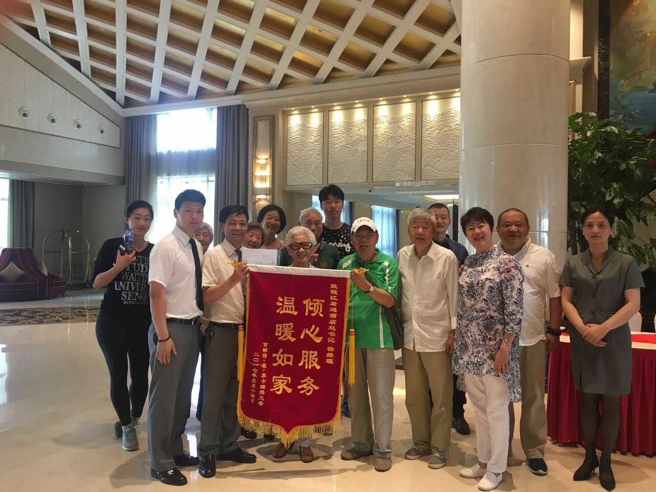 5月14日上午,即将离开酒店的美籍华裔吉娜特·钱·苏卡瑞女士携同父母,来到钱江君廷酒店的领导面前,送上了一面锦旗和一封感谢信,感谢酒店在她与父母入住期间给予的热情接待和周到服务。酒店党支部书记赵世祥、副总经理杨晓嵩接待了他们。