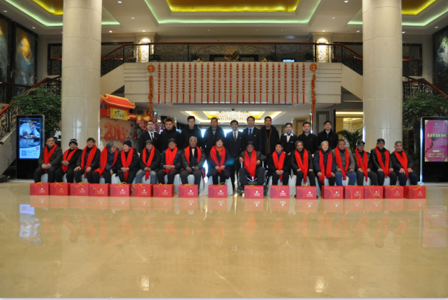 上午10时左右,18位老人在当地村干部的陪同下,陆续来到酒店,酒店党支部书记赵世祥和工会主席杨晓嵩带领管理人员在大堂等候,并将老人们迎往会议室小歇;赵世祥书记与杨晓嵩主席代表酒店欢迎老人们的到来,并与老人们亲切交谈,希望他们能热热闹闹地享用年夜饭,往后常来串门,并将酒店一早为老人们准备好的红围巾及年货礼盒呈上;老人们十分感动,连声道谢;餐间,酒店员工在两位领导的带领下一一向老人们敬酒,祝愿他们在新的一年里身体健康、幸福安康!