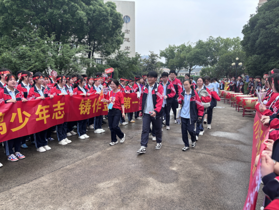 高三学子们整装待发,校领导、老师、家长和学弟学妹们围聚四周,为学子们加油鼓劲,那声声呐喊,如激昂的鼓点,为学子们注入了无限动力。