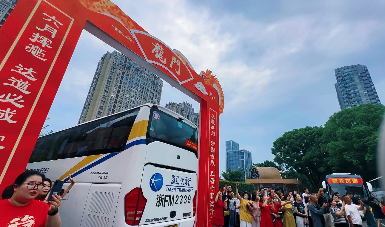 6月7日早上7点,海宁市宏达高级中学校门口聚满了送考的老师和家长,为奔赴考场的高考学子们送上充满爱与期待的祝福。