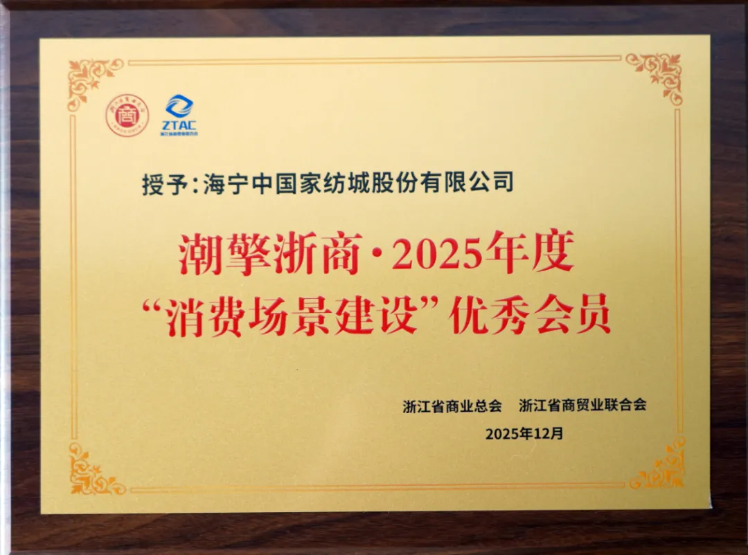 12月30日,由浙江省委社会工作部、浙江省商务厅、浙江工商大学、浙江交通集团指导,浙江省商贸业联合会、浙江省商业总会、浙江工商大学现代商贸研究中心联合主办的“潮擎浙商 向新提质”2025浙江商业高质量发展创新大会在杭州黄龙饭店隆重举行,会上集中表彰了浙江省商业总会、浙江省商贸业联合会“潮擎浙商·2025年度优秀会员”,海宁中国家纺城股份有限公司凭借在沉浸式体验、即时零售等消费场景建设上的创新实践,荣获“潮擎浙商·2025年度‘消费场景建设’优秀会员”称号。