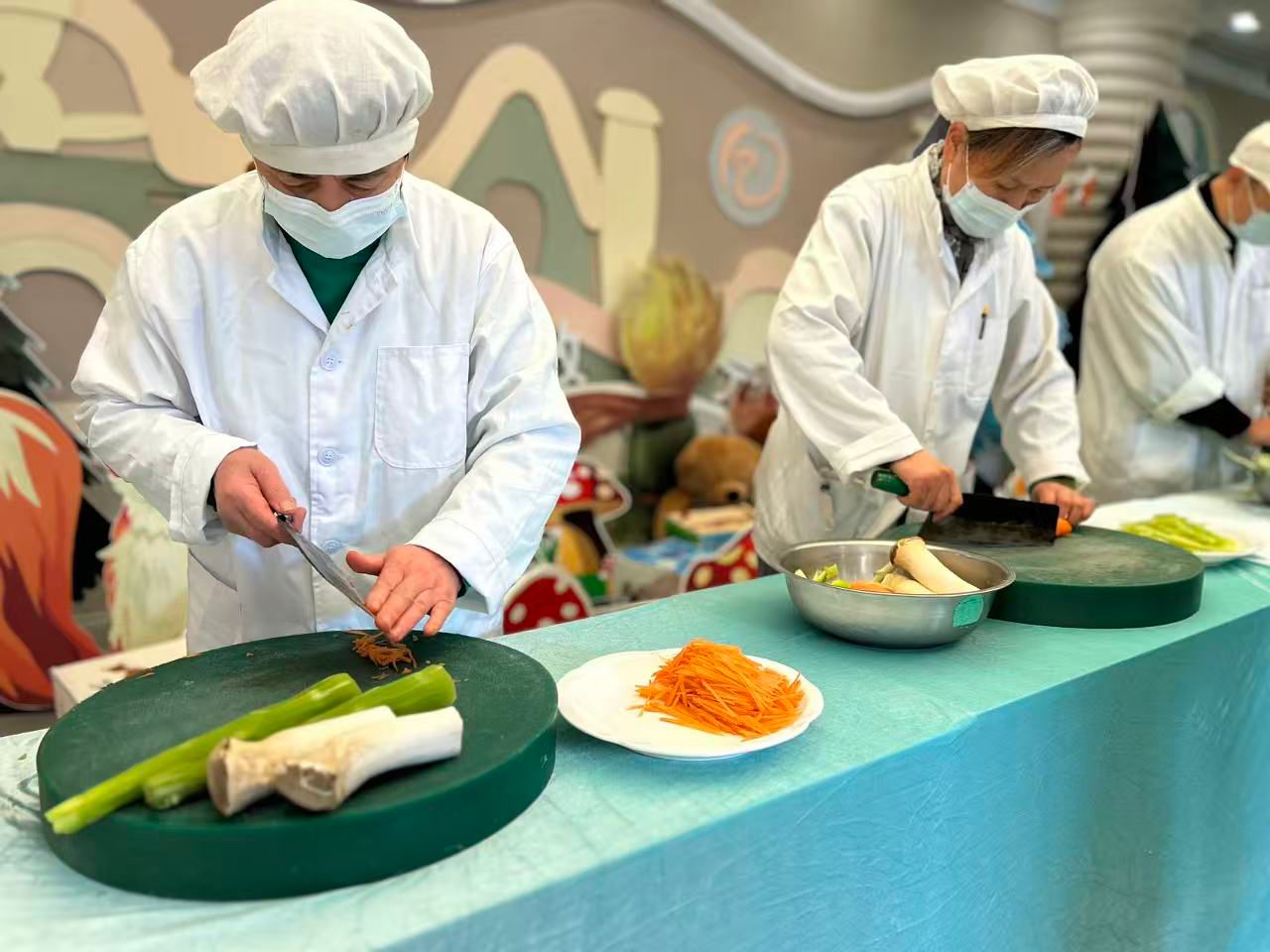 本次比武聚焦核心日常操作,设置两大竞赛项目。食堂组开展“刀工匠心”切配比赛,选手需在10分钟内将莴苣、胡萝卜、杏鲍菇进行切丝,评委从安全操作、成品规格均匀度、出成率等维度现场打分;保育组则进行“巧手暖心”叠被比赛,3人一组,选手需在8分钟内完成两种形式的床铺整理,既要将被子叠成棱角分明的“豆腐块”,又要完成双被铺叠的规范操作,评分重点围绕被子叠放质量、床铺美观度及操作熟练度进行打分。