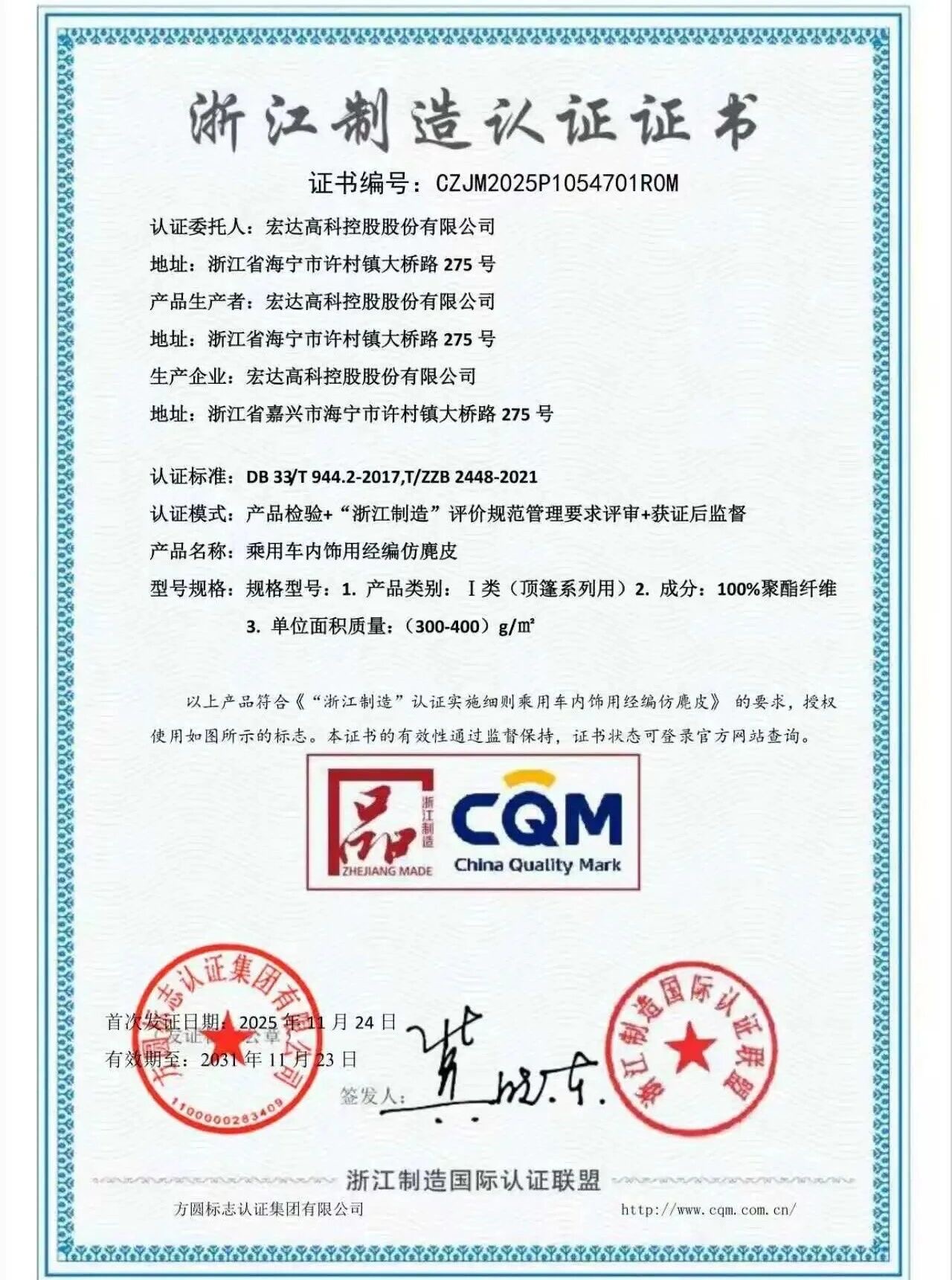 “宏达高科”乘用车内饰用经编仿麂皮产品荣获“浙江制造”认证